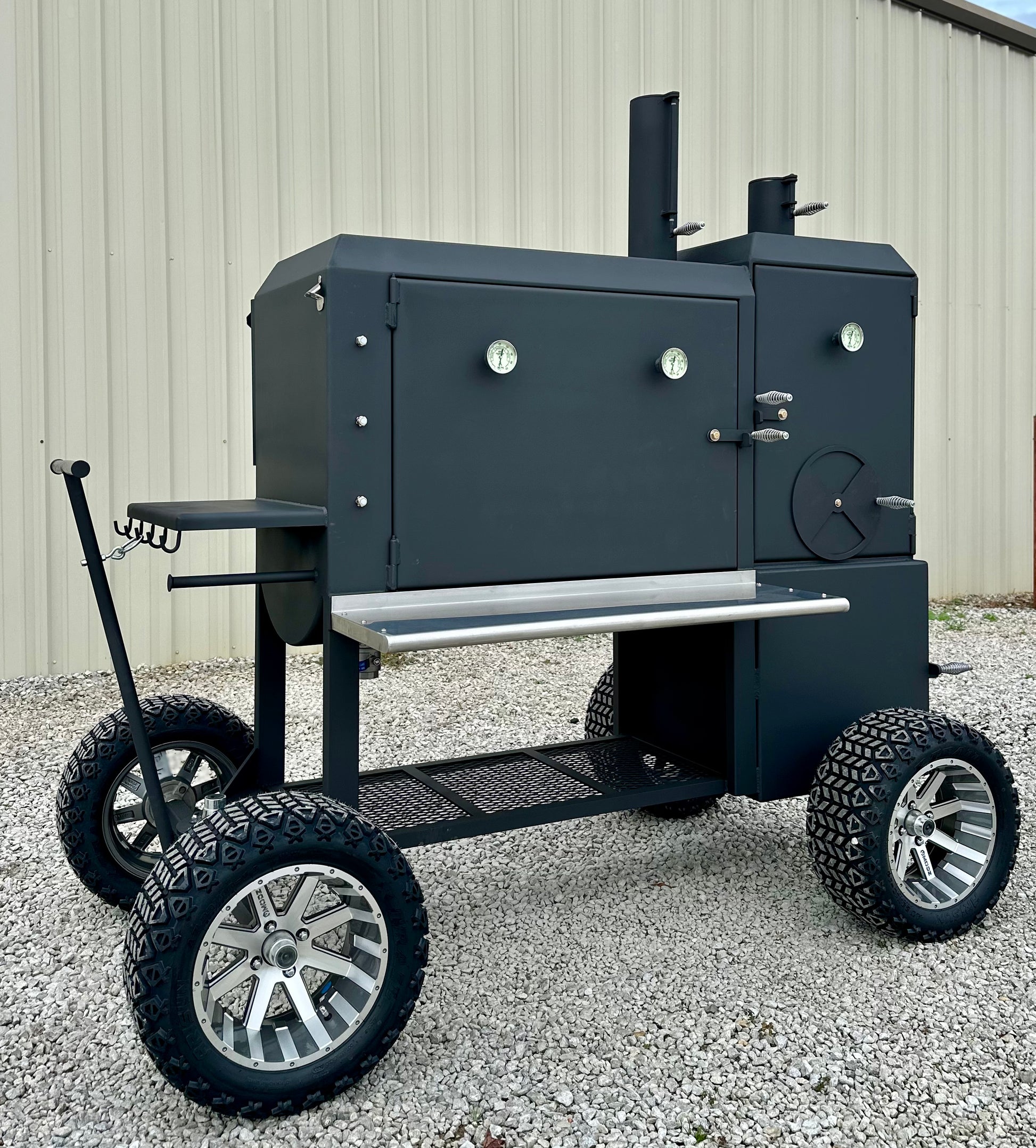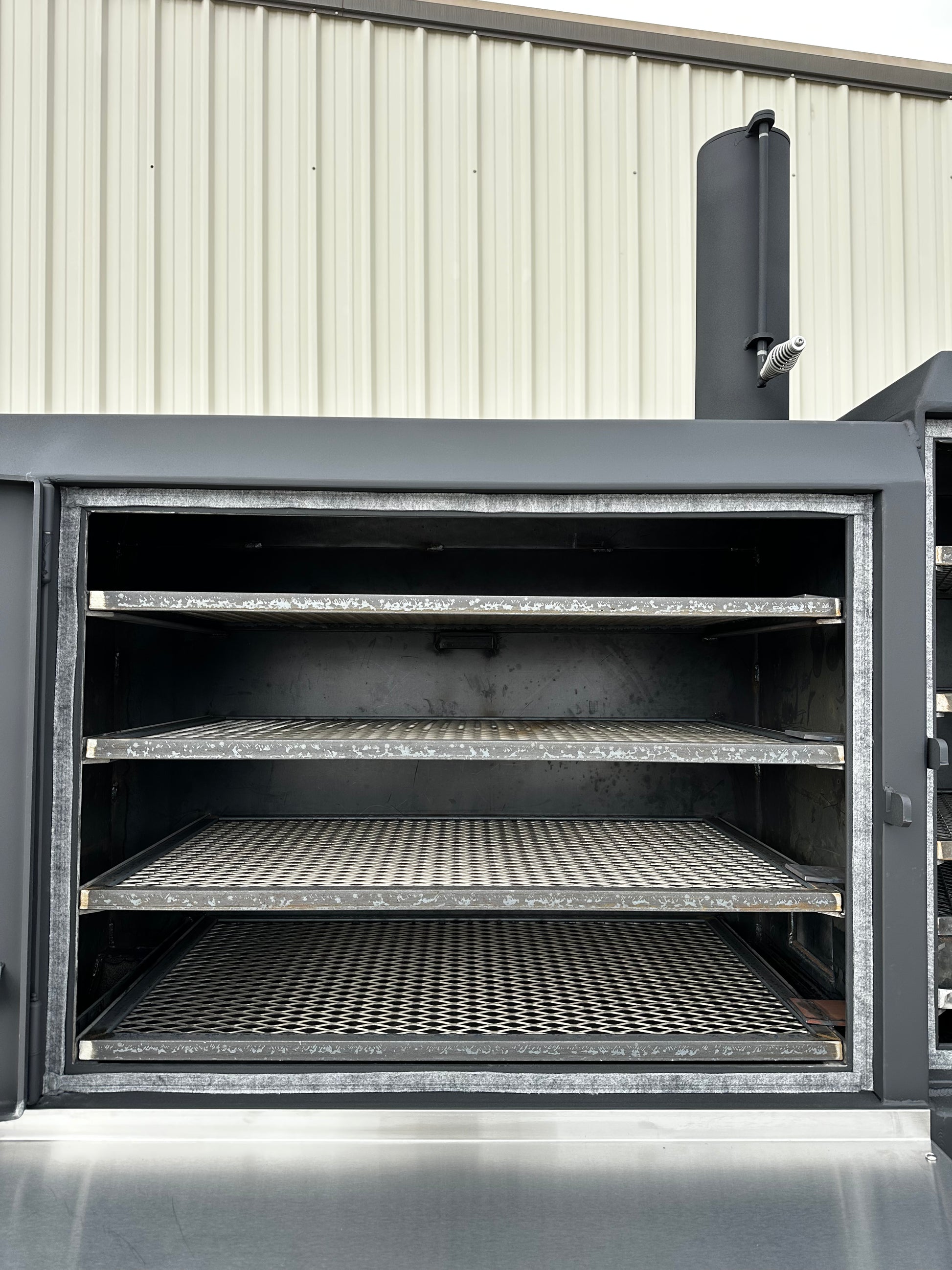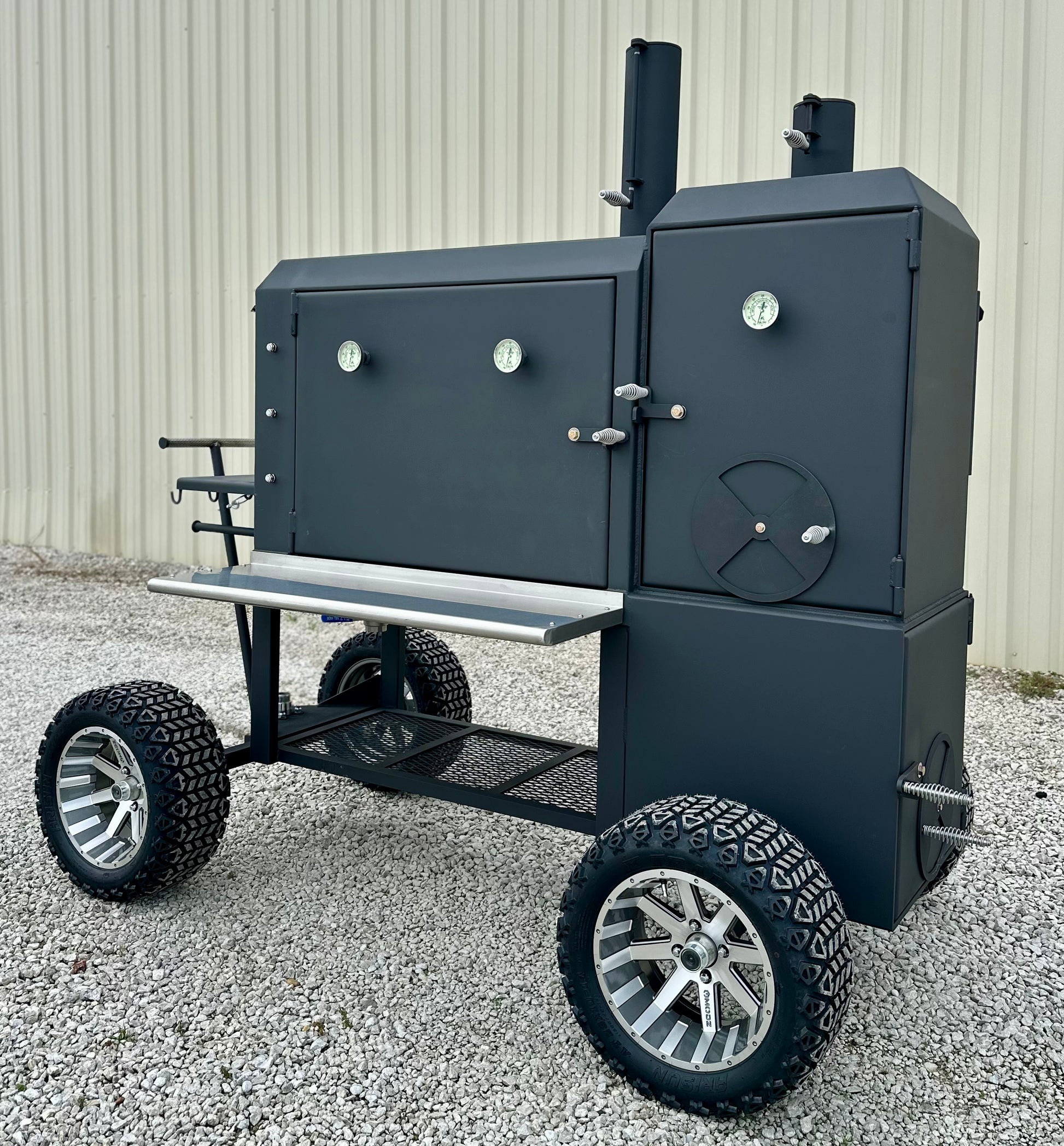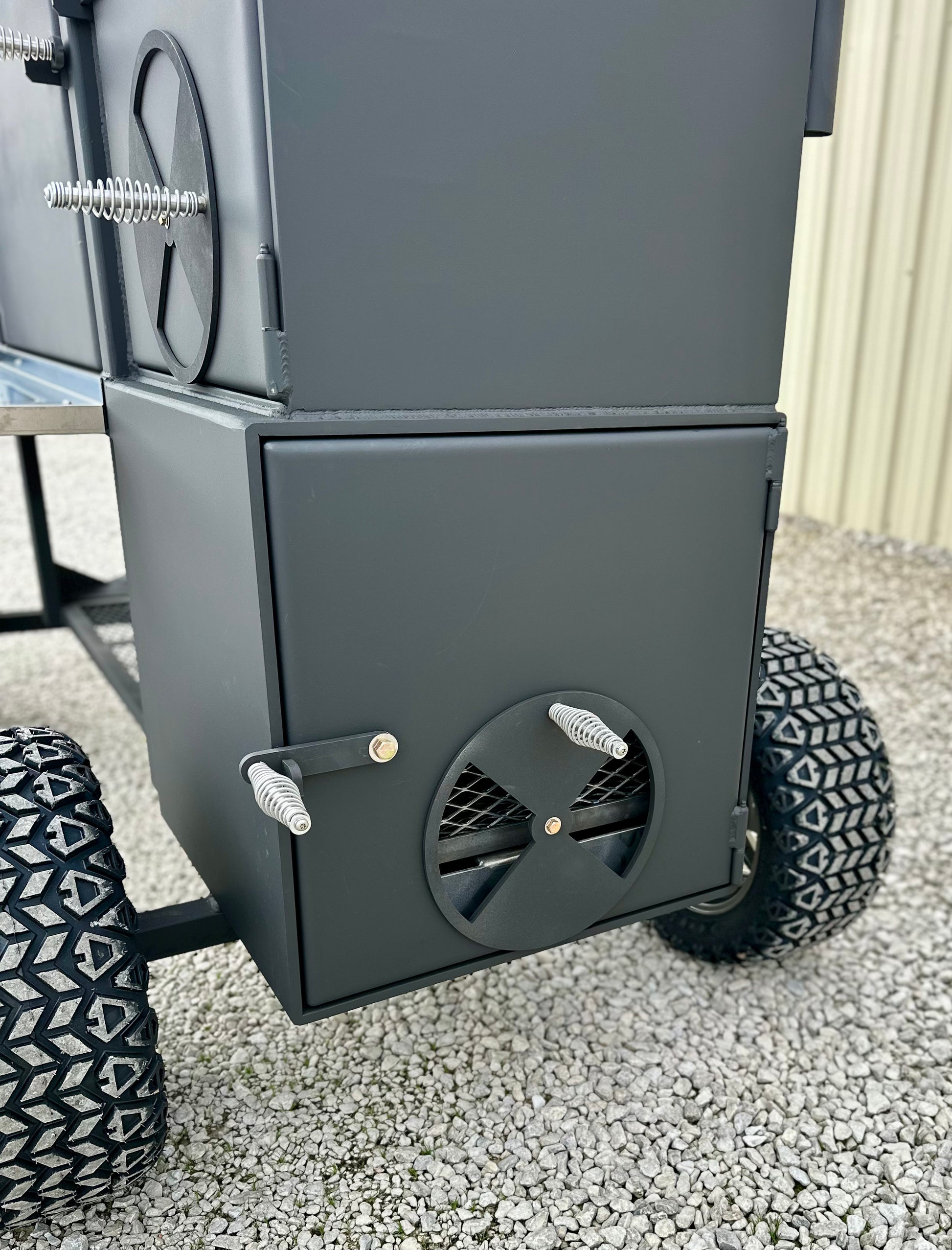 The MEAT LOCKER 48 has a reverse offset smoker design and features a 1/4" and 3/8” thick steel construction that is built to last. It showcases a 36"wide x 24"deep x 33"tall Smoke Chamber and 24" square Fire Box, all proudly manufactured in the USA. All cookers sandblasted and coated with 3 Coats of High Temp Paint.